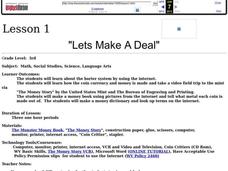 Third graders make a picture money book. In this money lesson, 3rd graders read The Monster Money Book, discuss money terminology, watch a video on money and draw an example of the barter system. Students use the Internet to find...