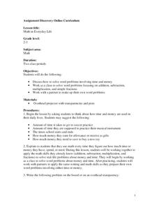 Second and third graders solve word problems involving both time and money. First the class works together to solve basic addition, subtraction, multiplication, and simple fraction problems (these examples are provided). After solving...