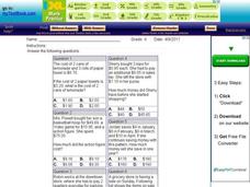 In this money math worksheet, 4th graders write multiplication equations to solve a set of 6 word problems. Answers are included on page 2. A reference web site is given for additional activities.