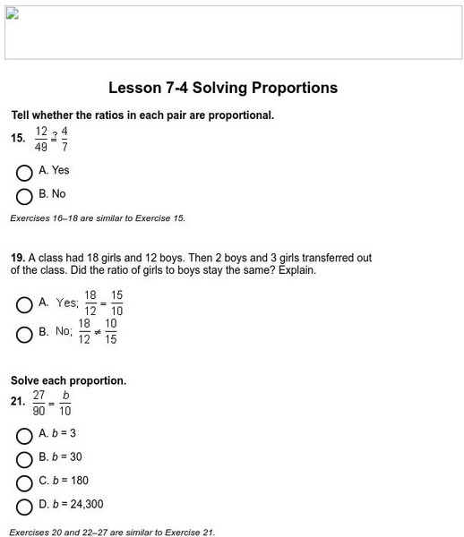 Use Glencoe's randomly generated self-checking quiz to test your knowledge of solving proportions. Each question has a "Hint" link to help. Choose the correct answer for each problem. At the bottom of the page click the "Check It" button...
