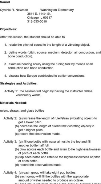 This site provides a lesson plan designed for primary students over a three week period. Students learn concepts of vibration, communication,and pitch.