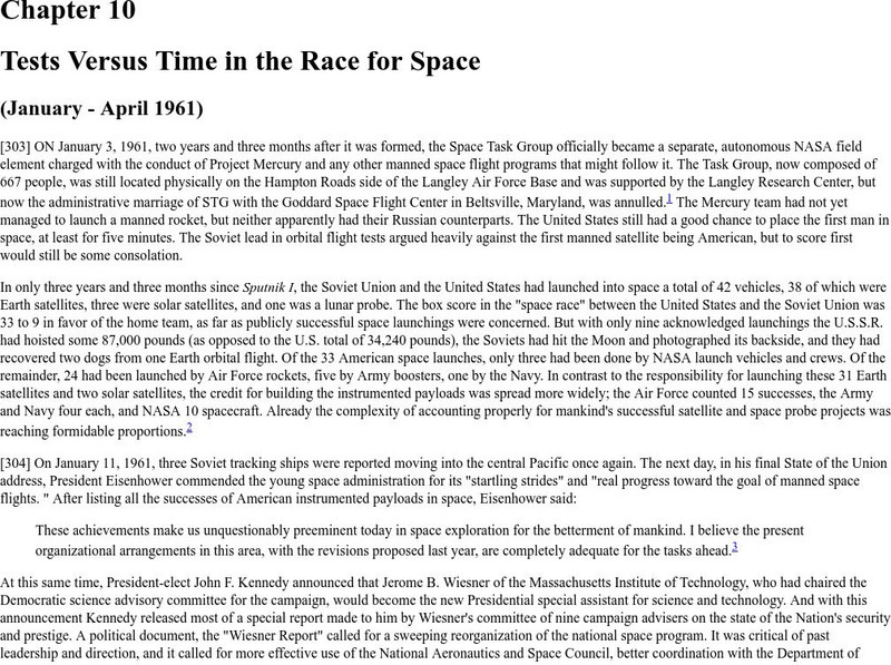 This NASA site offers a good description of the ongoing space race during the Kennedy administration, discussing the "nip and tuck" of the Soviet-U.S. race. Also includes a description of Kennedy's new special assistant for science and...