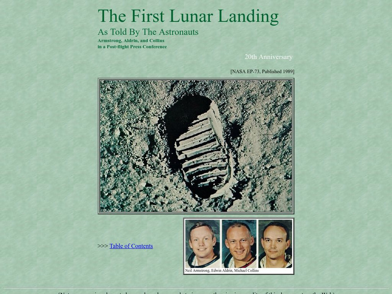 This site from NASA is extensive and contains a deep supply of information about the historical moon landing. Click on "Table of Contents" to proceed through the site. Wonderful images!