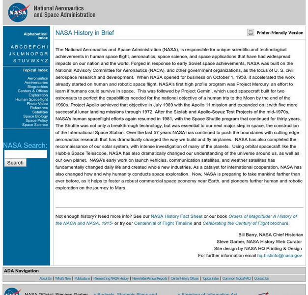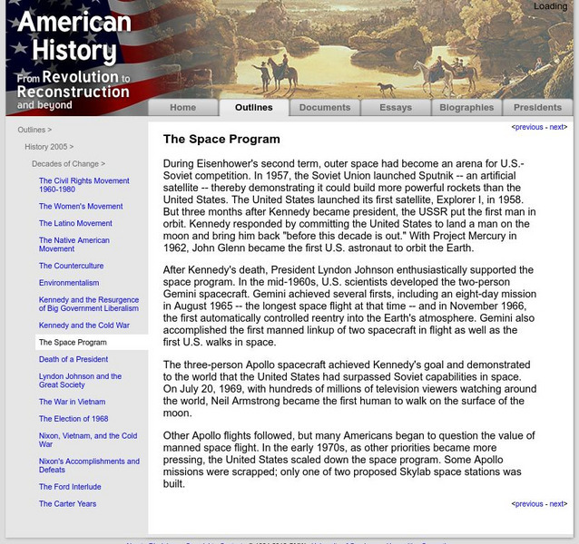 This site includes a lesson for teachers to use when teaching about America's space program. Also included is the history of the space program, maps, readings, images of the space program, and benefits that resulted from space research.