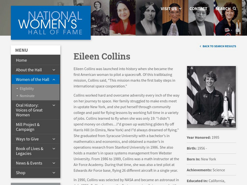 This short biography tracks the life of Eileen Collins, first woman to pilot a space shuttle and command a space shuttle mission.