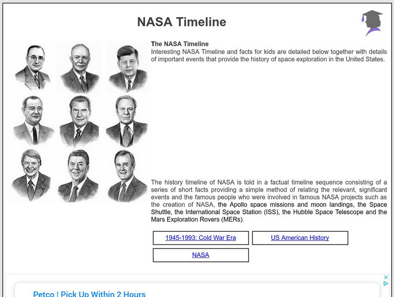 This interesting NASA timeline provides the dates and facts about the important events and people involved in space exploration in the United States.