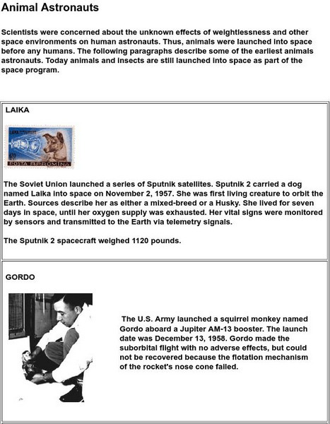 Information about some of the early animal astronauts who were launched into space to help determine the effects of space travel on human beings.