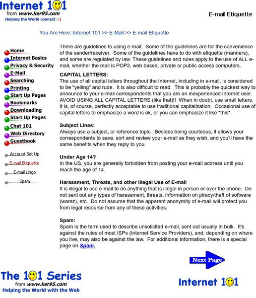 This site from the 101 Series describes different types of guidelines for sending emails. Some of the guidelines are for the convenience of the sender/receiver. Some of the guidelines have to do with etiquette (manners), and some are...