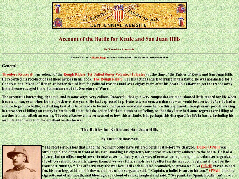 An account by Theodore Roosevelt of the assaults on Kettle and San Juan Hills by his Rough Riders in Cuba during the Spanish American War.