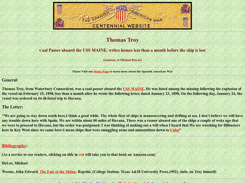 Spanish American War Centennial: Thomas Troy: Coal Passer: Uss Maine: Letter