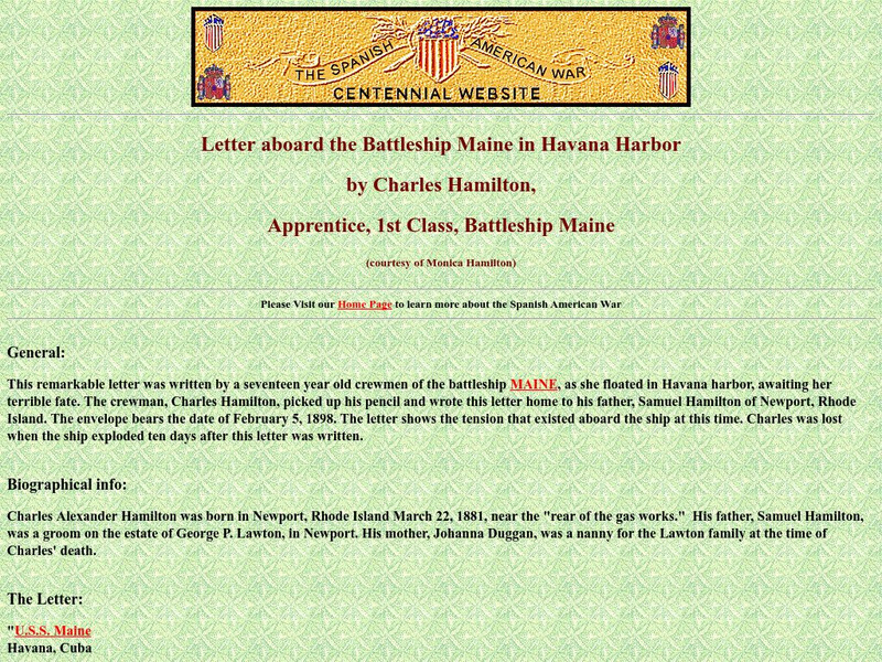 Spanish American War Centennial: Letter From Charles Hamilton: Battleship Maine: Havana Harbor