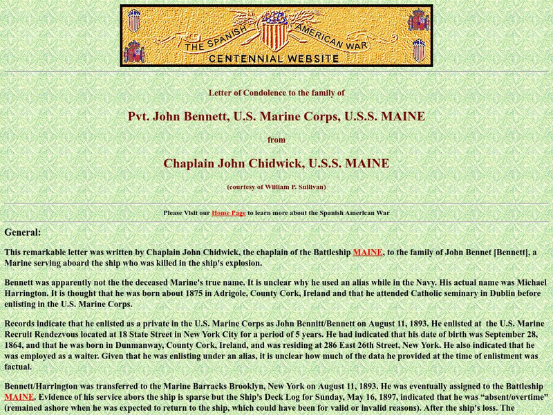 Letter of Condolence to the family of Pvt. John Bennett, U.S. Marine Corps, U.S.S. Maine from Chaplain John Chidwick, U.S.S. Maine.