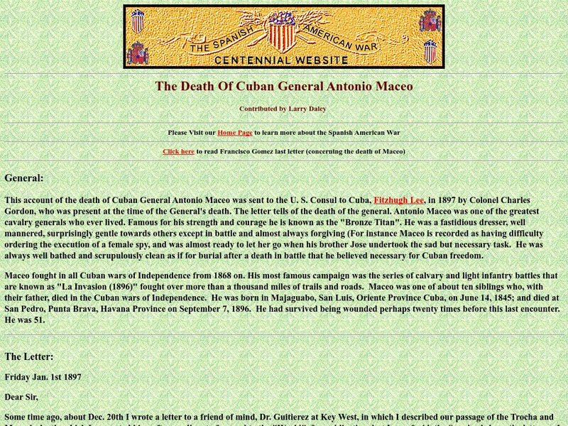 An account of the death of Cuban General Antonio Maceo sent to the U. S. Consul to Cuba, Fitzhugh Lee, in 1897 by Colonel Charles Gordon, who was present at the time of the General's death.