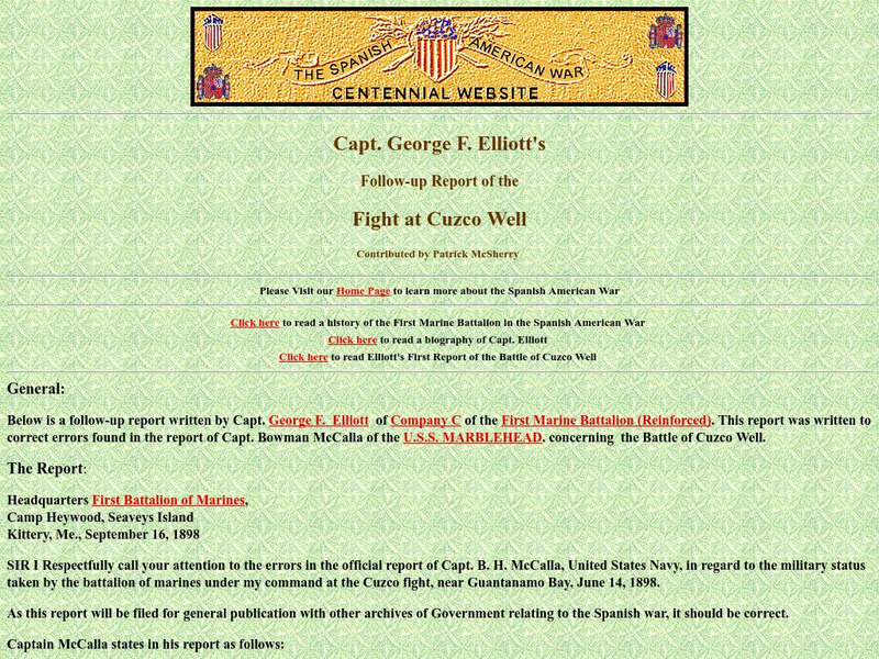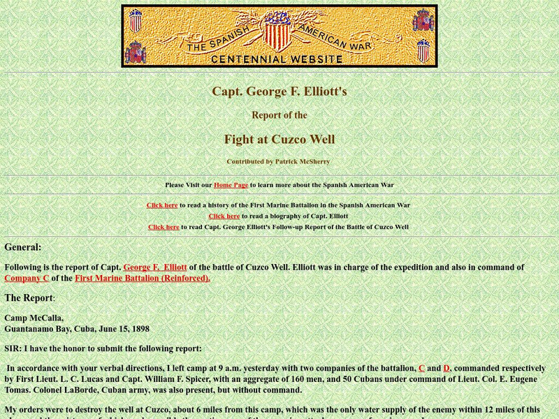 Primary source material on the Battle of Cuzco Well as reported by Capt. George F. Elliott. Elliott was in charge of the expedition and also in command of Company C of the First Marine Battalion during the Spanish-American War.
