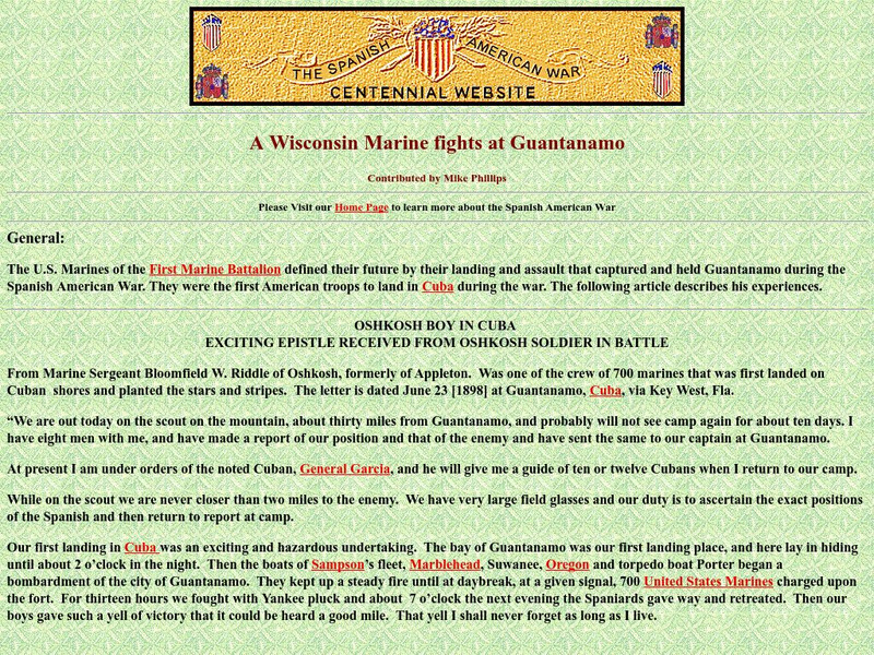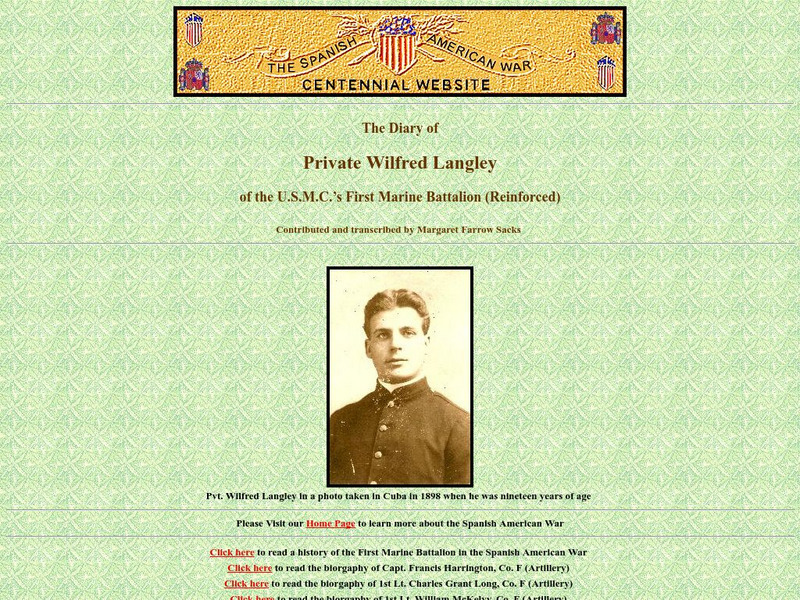 Spanish American War Centennial Website presents the diary of Private Wilfred Langley who was part of the U.S.M.C.'s First Marine Battalion (Reinforced) capture of Guantanamo in Cuba.