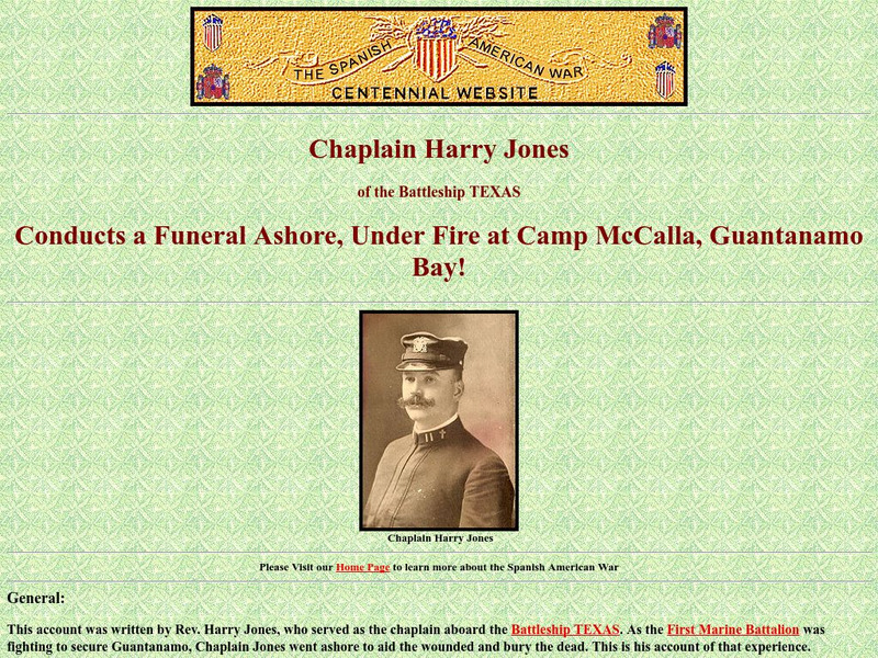 Account written by Rev. Harry Jones, who served as the chaplain aboard the Battleship TEXAS. Chaplain Jones went ashore to aid the wounded and bury the dead as the First Marine Battalion was fighting to secure Guantanamo during the...