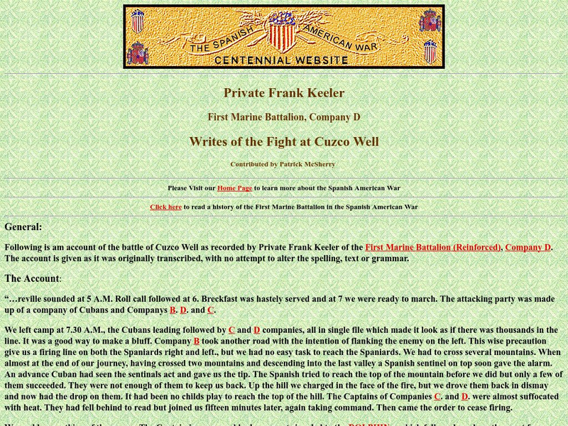 Spanish American War Centennial Website presents an account of the fight at Cuzco Well from Private Frank Keeler, First Marine Battalion, Company D.