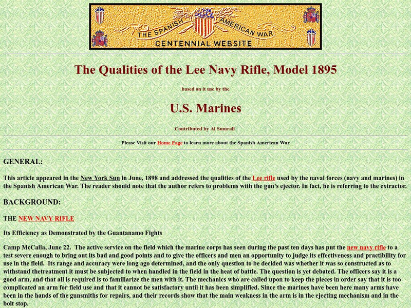 Article originally appeared in the New York Sun in June, 1898, addressed the qualities of the Lee rifle used by the naval forces and marines during the Spanish American War.