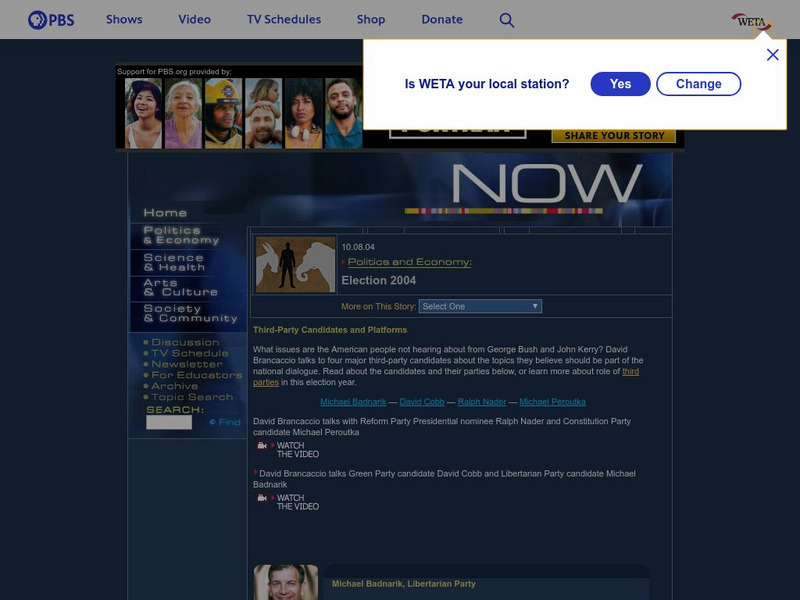 NOW looks at the third parties, the candidates, and platforms, in October, 2004, for the 2004 Presidential election. Biographical information and video discussions can be found on this page.