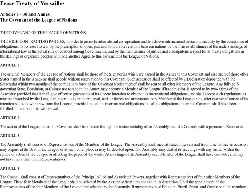 This site contains the text of the covenant of the League of Nations from the Peace Treaty of Versailles.