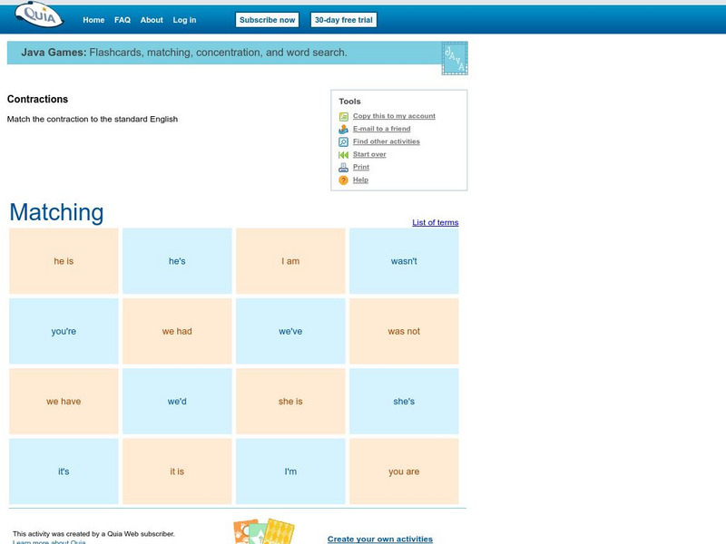 An interactive matching game which allows elementary students to connect phrases with their contracted form. Offers a few different games and includes graphics and motion.