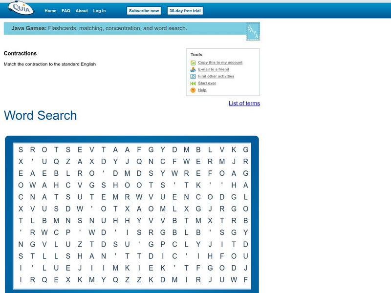 An interactive game in which students must "find" the contractions embedded in a word search. Contractions may be found horizontally, vertically, diagonally, forwards or backwards.