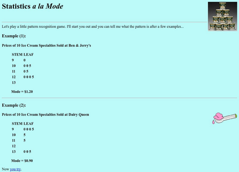 Site from the University of Illinois gives examples using stem and leaf plots to find the mode. It also provides practice examples for students to try. It gives the correct answers and provides a definition of the word mode and where it...