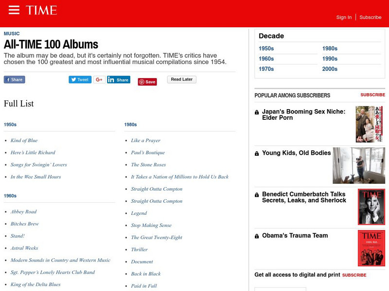A comprehensive list of the 100 most influential record albums. Each album can be clicked to provide information as to why it was chosen.