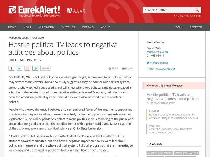 Eurek Alert: Hostile Political Tv Leads to Negative Attitudes