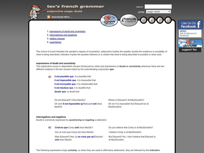 This site from Tex's French Grammar explains use of the subjunctive with expressions of doubt and uncertainty, interrogatives and negatives, relative clauses that express uncertainty and superlatives. Provides usage examples, dialogues...