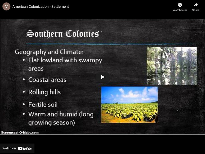 A teacher-created video lesson that focuses on the Northern Colonies, Middle Colonies, and Southern Colonies, primarily their geography, climates, and resources. [7:02]