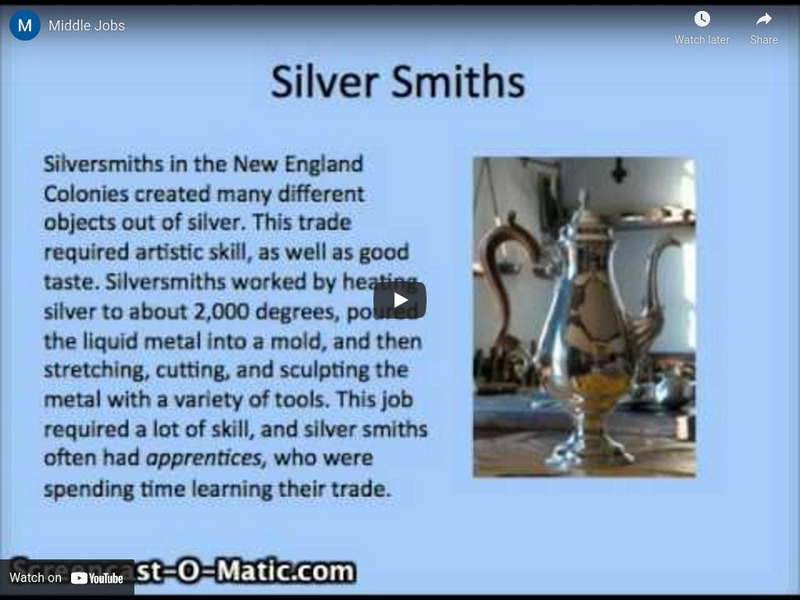 Describes some of the main occupations people in the Middle Colonies were able to do. Includes farmers, tailoris, silversmiths, and brick makers and builders. [2:13]