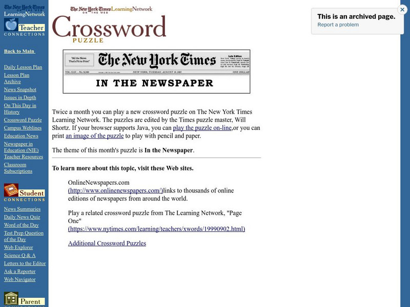 An interactive and printable crossword puzzle developed by the New York Times Learning Network. The theme of this puzzle is In the Newspaper. Other links are included.