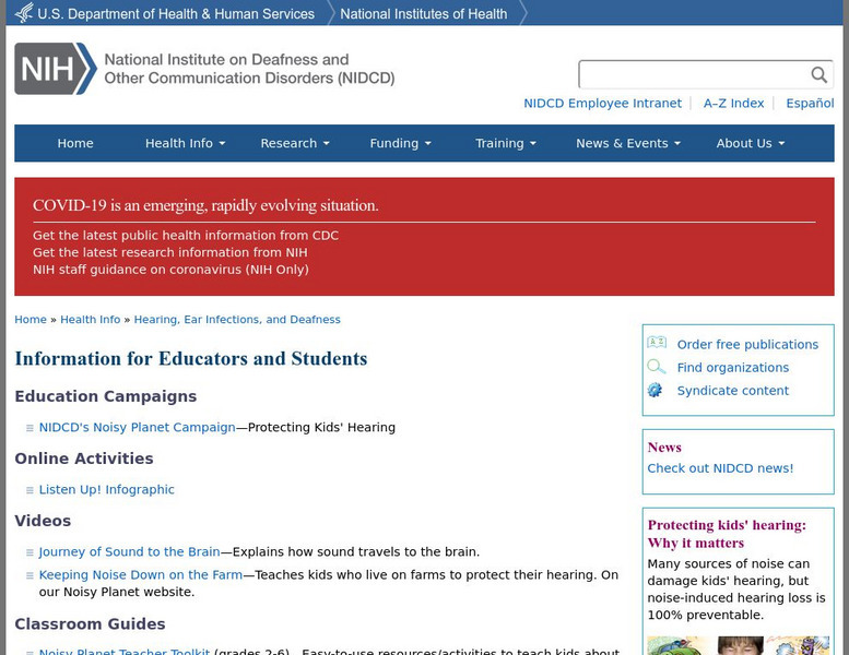 The National Institute on Deafness and Other Communication Disorders offers classroom activities and other resources for young scholars and teachers.
