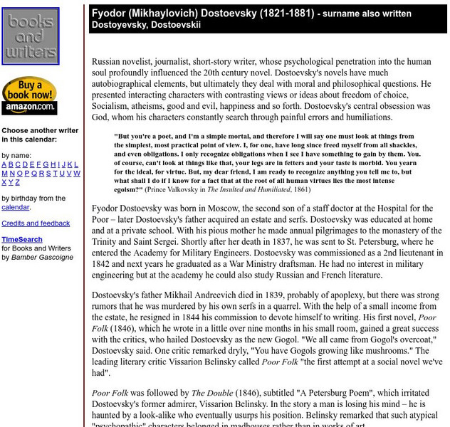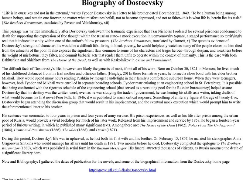 This site presents an accurate account of the events in the life of Fyodor Dostoevsky. Also includes a bibliography of works by and about the author.