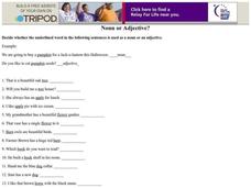 In this noun or adjective worksheet, students determine if the underlined word in each sentence is a noun or an adjective. Students complete 16 problems total.