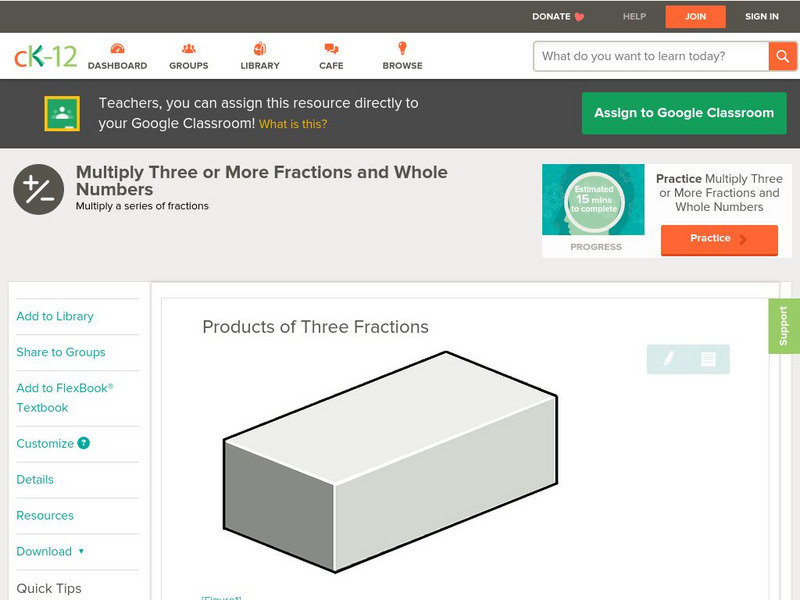 [Free Registration/Login may be required to access all resource tools.] In this lesson students find the product of three fractions multiplied together. Students examine guided notes, review guided practice, watch instructional videos...