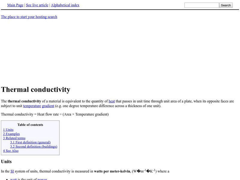 Fact-Index.com offers an excellent site on thermal conductivity. Includes table of contents, hyperlinked terms, and formulas.