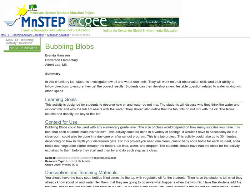 In this chemistry lab, students investigate how oil and water don't mix. They will work on their observation skills and their ability to follow directions to ensure they get the correct results. Students can then develop a new, testable...