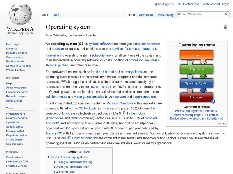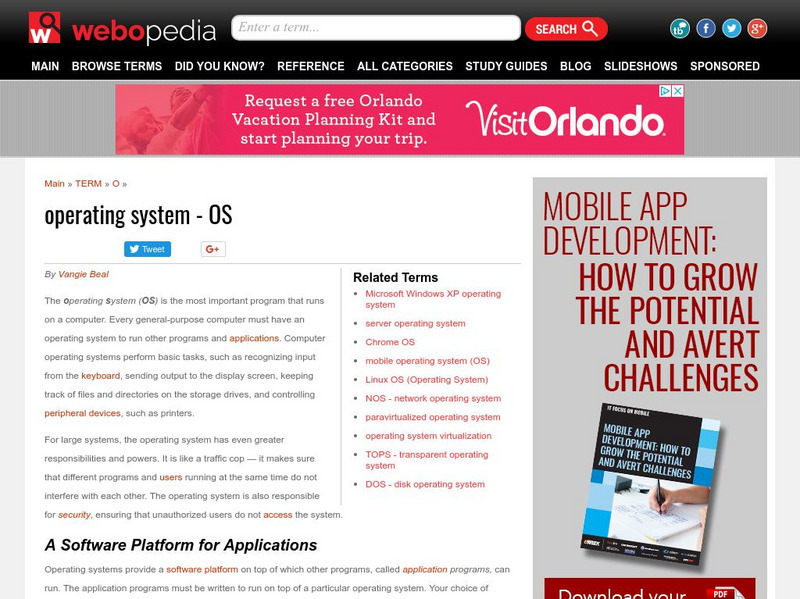 This entry provides information about computer operating systems and classifications. Includes linked definitions, and an illustration.
