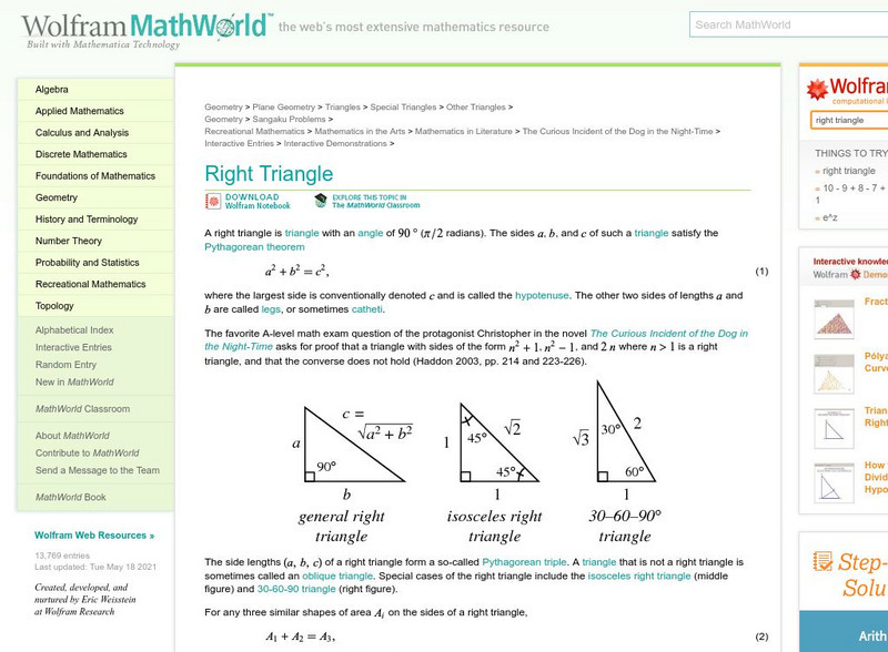 This site from MathWorld.com offers extensive information on right triangles. The site contains information on numerous characteristics of right triangles, including constructing similar inscribed triangles, altitudes, Pythagorean...