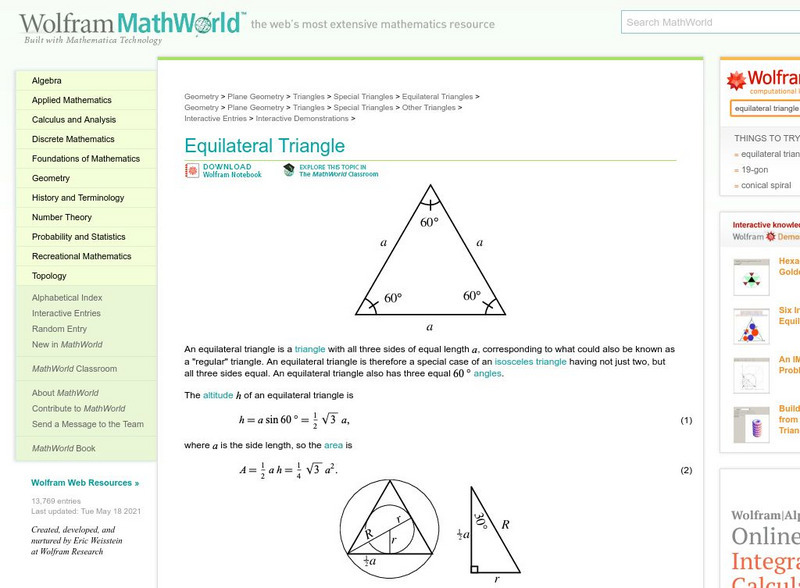 MathWorld goes into detail about equilateral triangles at this site. Use this site to find out how to construct an equilateral triangle using a compass and straight edge. Learn about the altitude of such triangles, and the rationality of...