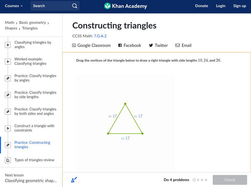 Practice constructing triangles. Students receive immediate feedback and have the opportunity to try questions repeatedly, watch a video or receive hints.