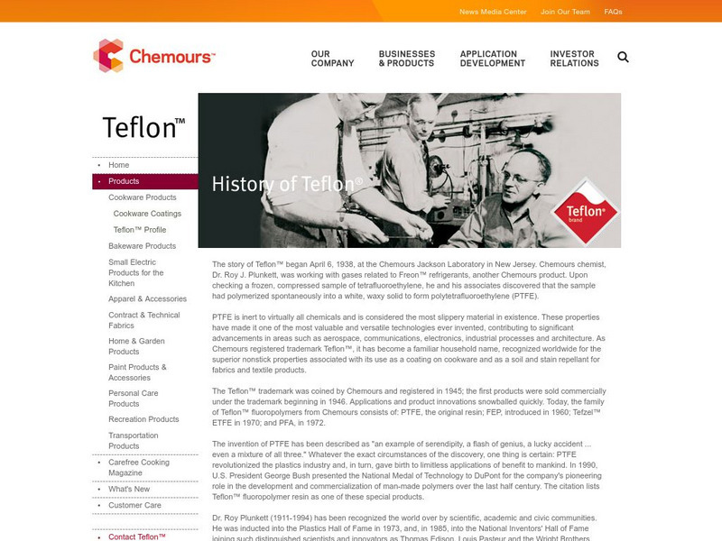 This website tells the history of the development of teflon, and incldues information on Dr. Roy Plunkett, the inventor of teflon.