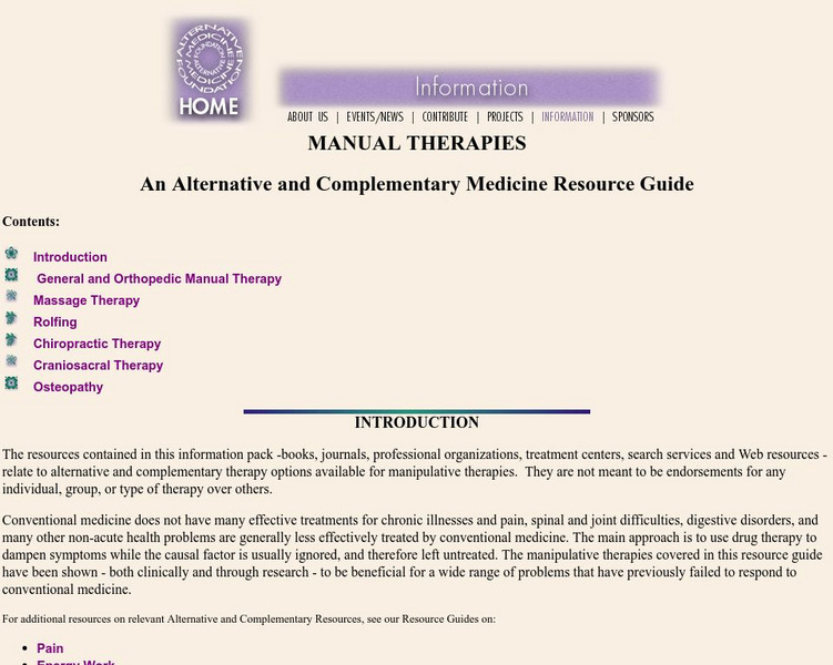Basic information on all types of manual therapies. Related books, resources, Web links, professional organizations, and local treatment centers are all included.