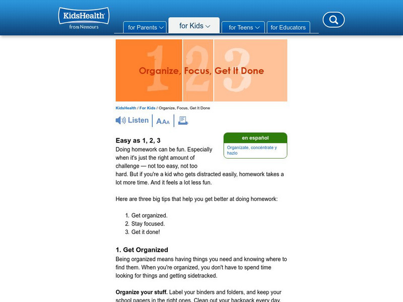 KidsHealth publishes these doctor-approved recommendations for getting organized, staying focused, and finishing homework on time. Advice is written directly to students and covers topics ranging from how to avoid distractions, how to...