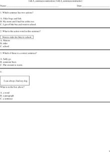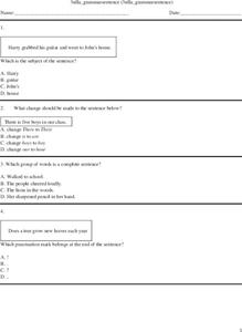 In this language arts review first grade: sentence construction learning exercise, 1st graders answer 15 multiple choice questions in standardized test format about sentences.