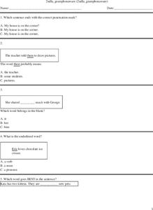 In this language arts for grade 2 worksheet, 2nd graders answer 15 multiple choice questions in standardized test format about punctuation, grammar and parts of speech.