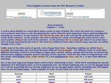 In this parts of speech worksheet, students read about the different parts of speech including past, present, future, singular, plural, and more. Students complete a quiz on the parts of speech where they answer 10 multiple choice...