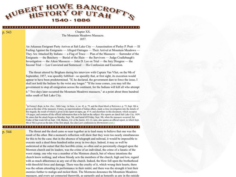 A chapter from Bancroft's history of Utah, published in 1899, about the Mountain Meadow Massacre.